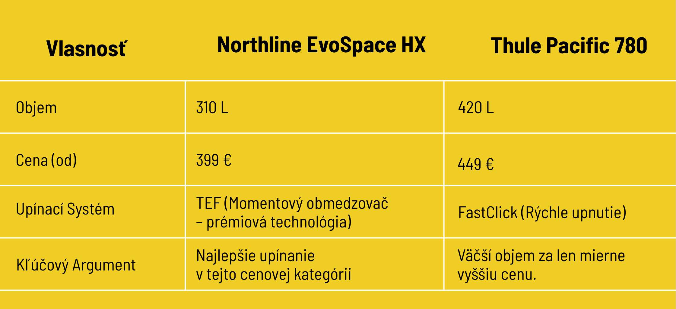 Závery z porovnania: Ak je vaša priorita najmodernejšia upínacia technológia a úspora, zvoľte Northline EvoSpace. Ak potrebujete maximálny objem pod 450 €, je Thule Pacific 780 jasnou voľbou.