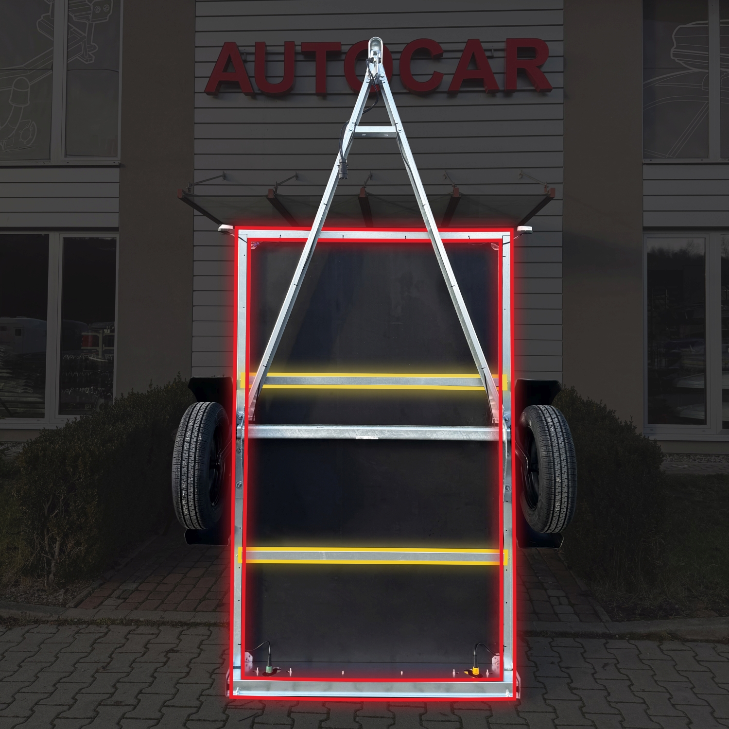 Jednonápravový nebrzdený prívesný vozík s celorámovou konštrukciou výšky 6cm a s dvoma priečnymi výstuhami zabezpečuje vysokú pevnosť a stabilitu aj pri plnom zaťažení. Pre bezpečné uchytenie nákladu sú v podlahe umiestnené štyri kotviace oká. Vozík je vybavený silnými profilovanými bočnicami vyrobenými z pozinkovaného plechu, čo zaručuje dlhú životnosť a ochranu proti korózii.