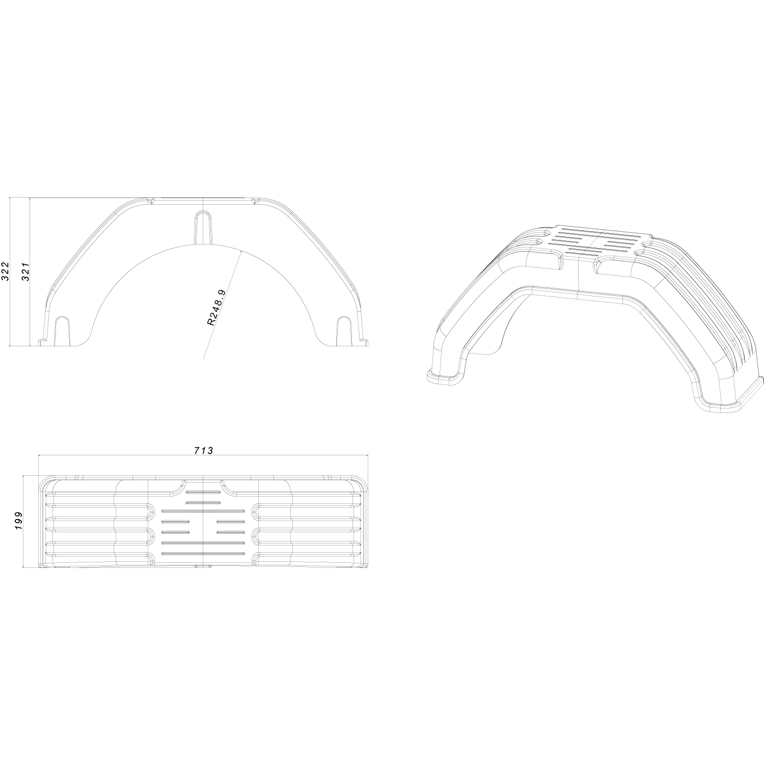 Plastový blatník na 13-palcové kolesá, rozmery: 713 x 321 x 199 mm. Univerzálny plastový blatník.