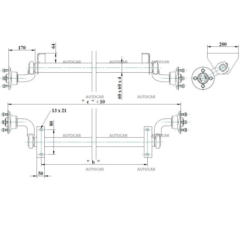 KNOTT náprava, typ VG7-L, nebrzdená, nosnosť do 750 kg, rozteč montážnych otvorov 1000 mm, šírka nápravy cez náboje 1430 mm, šróbenie náboja 100x4