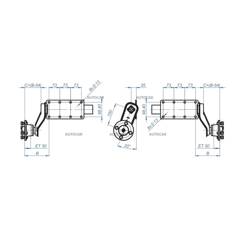 Delená náprava s nosnosťou do 750kg, ľavá strana od značky SPP, je nebrzdená šróbenie náboja je 4x100, rozmer ložiska 30x60mm.