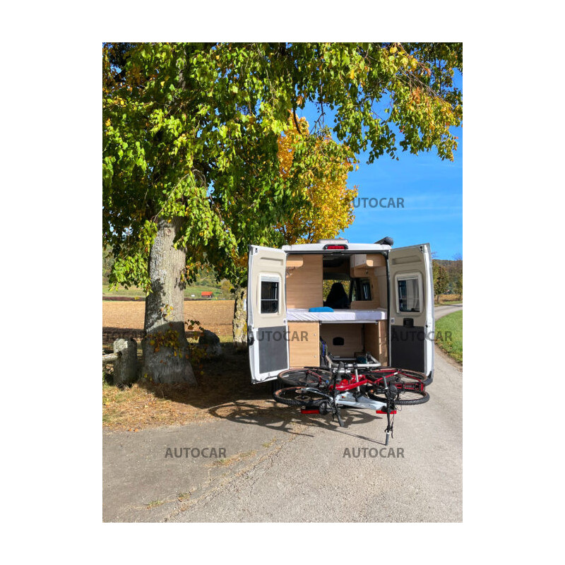 Jedinečný, špeciálny,  skladací a spratný nosič pre 3 veľké bicykle (Fatbike, Downhill), pre dodávky/panelové dodávky so zadnými dverami otváranými do boku a vozidlá s veľkými dverami batožinového priestoru s jednoduchou inštaláciou na ťažné zariadenie vďaka rýchloupínaciemu systému IQ