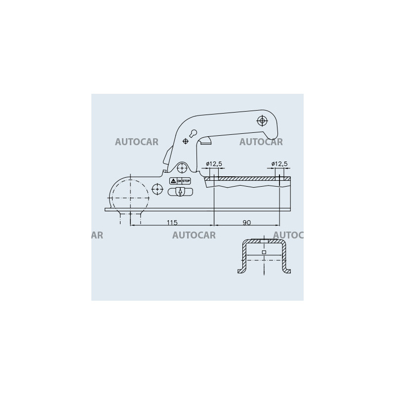 Prívesný kĺb do 1500 kg na oje štvorcového prierezu s rozmerom 60 mm, max. vertikálne zaťaženie 100 kg.