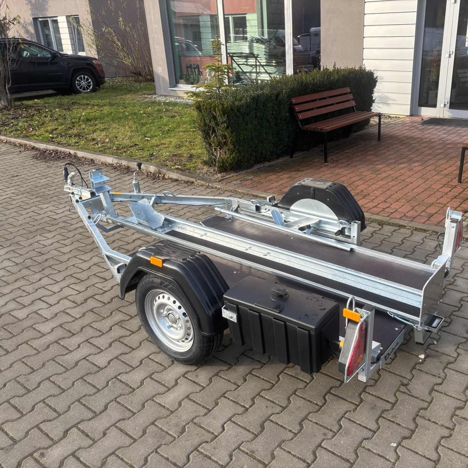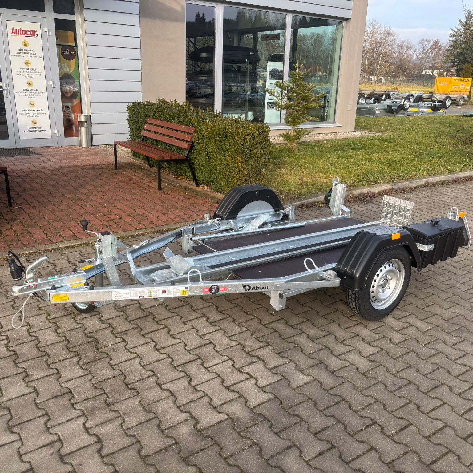 Nebrzdený jednonápravový prívesný vozík na prepravu motoriek od značky Debon so sklápaním pomocou "pedálu". Príves dokáže odviezť jeden motocykel v cene má aj box so zamknutím na náradie alebo gurtne a na konci prívesu má malú rampu pre ľahšie nakladanie motorky. Príves je žiarovo zinkovaný pre ochranu pred koróziou taktiež má oporné koliesko v cene. Preglejka na prívese zabezpečuje ľahké nakladanie aj vykladanie a má 8 bodov kotviacich bodov.