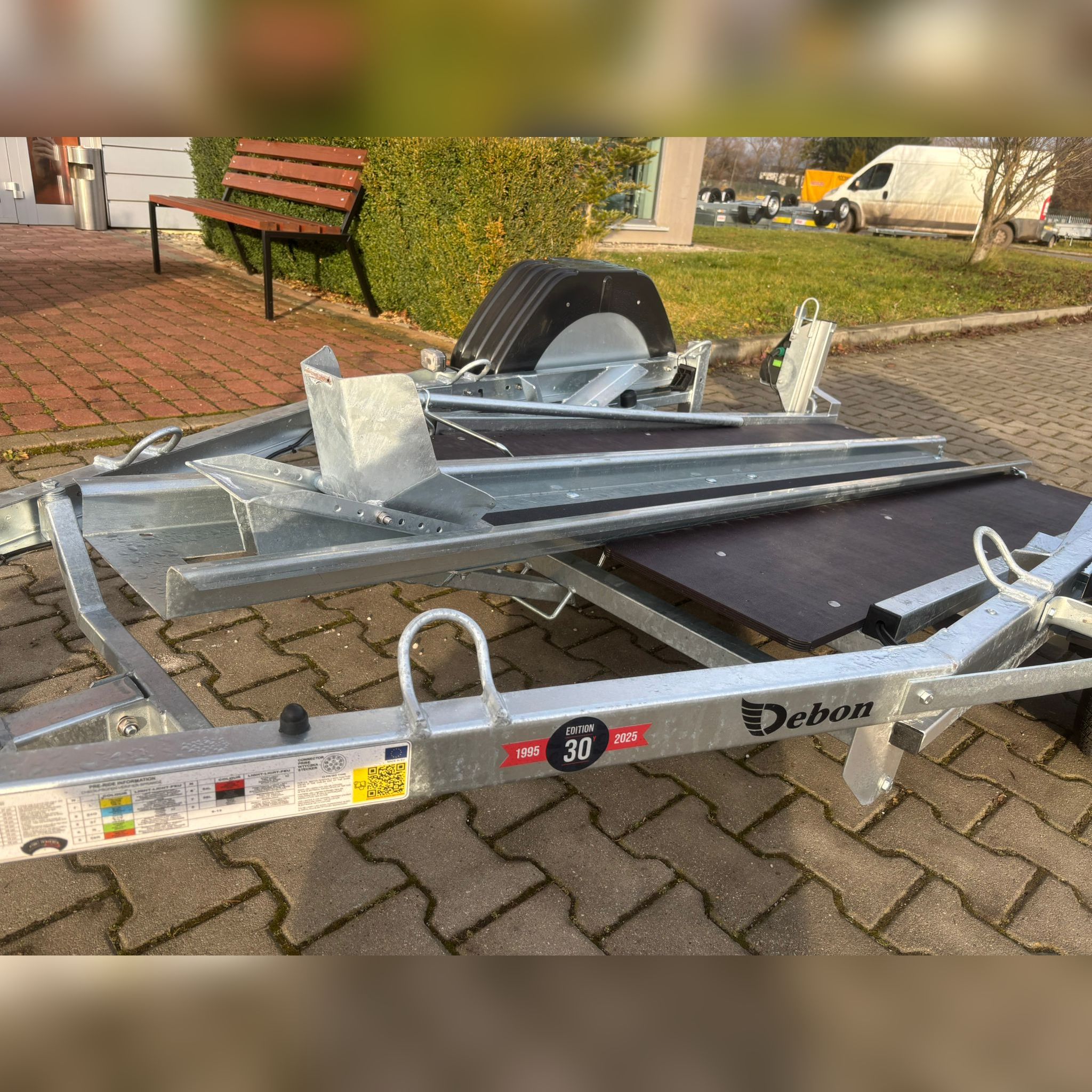 Nebrzdený jednonápravový prívesný vozík na prepravu motoriek od značky Debon so sklápaním pomocou "pedálu". Príves je vybavený ôsmimi kotviacimi bodmi, ktoré boli navrhnuté a testované tak, aby počas prepravy bezpečne udržali akýkoľvek motocykel. Aby poskytol maximálne pohodlie pri nakladaní a vykladaní, Moto1 má vlastnú podlahu prívesu, ktorá umožňuje jazdcovi jednoducho nasadnúť a zísť z motocykla bez akýchkoľvek komplikácií. Nakladanie a vykladanie motocykla môže byť na niektorých iných prívesoch náročné, no s prívesom Moto1 je tento proces jednoduchý a priamočiary. Sklopná plošina uľahčuje nakladanie aj vykladanie a vďaka nízkemu nájazdovému uhlu a absencii potreby pripevňovať rampy je Moto1 ideálnou voľbou pre každého motocyklistického nadšenca.