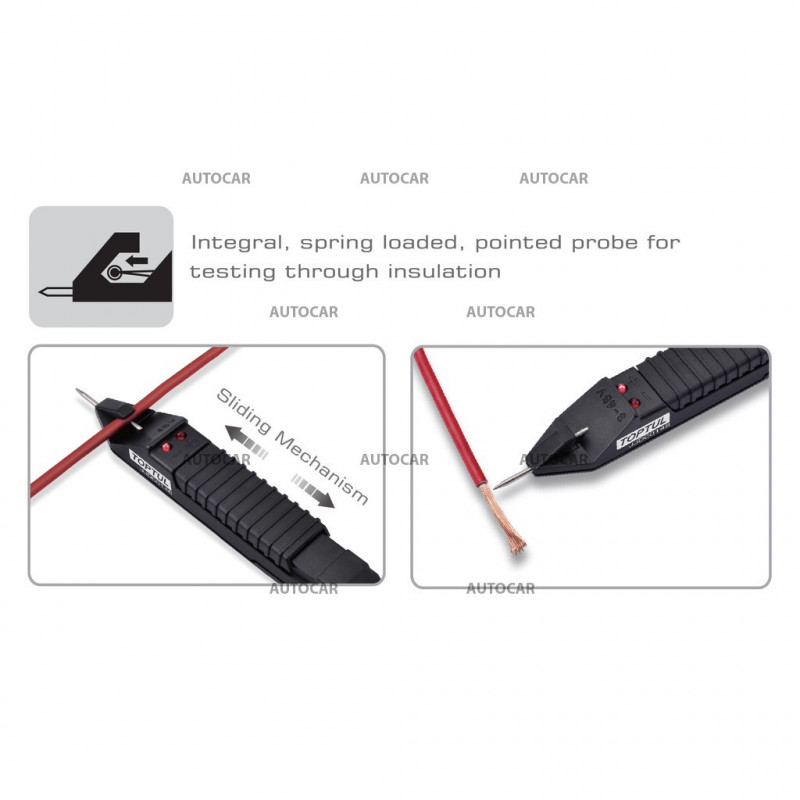 Skúšačka automobilových obvodov TOPTUL dokáže merať elektrické napätie od 3 - 48 V. Táto skúšačka je skvelým pomocníkom pri montáži elektroinštalácie ťažného zariadenia.